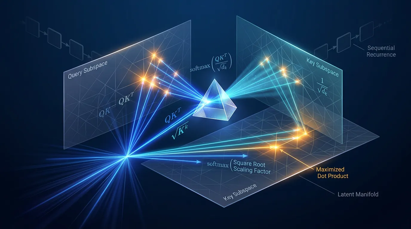 Master the algebra of alignment. Define dot products for high-dimensional manifolds, analyze O(1) interaction, and fix gradient vanishing via scaled attention.