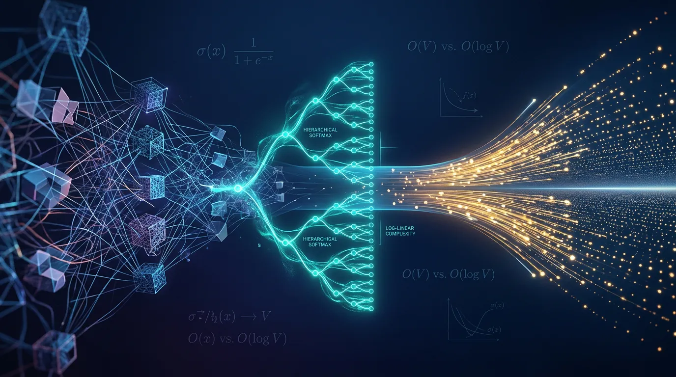 Master the Dual Bottleneck theory. Contrast Hierarchical Softmax with NNLMs, calculate Huffman tree efficiency, and optimize architectures for massive scale.