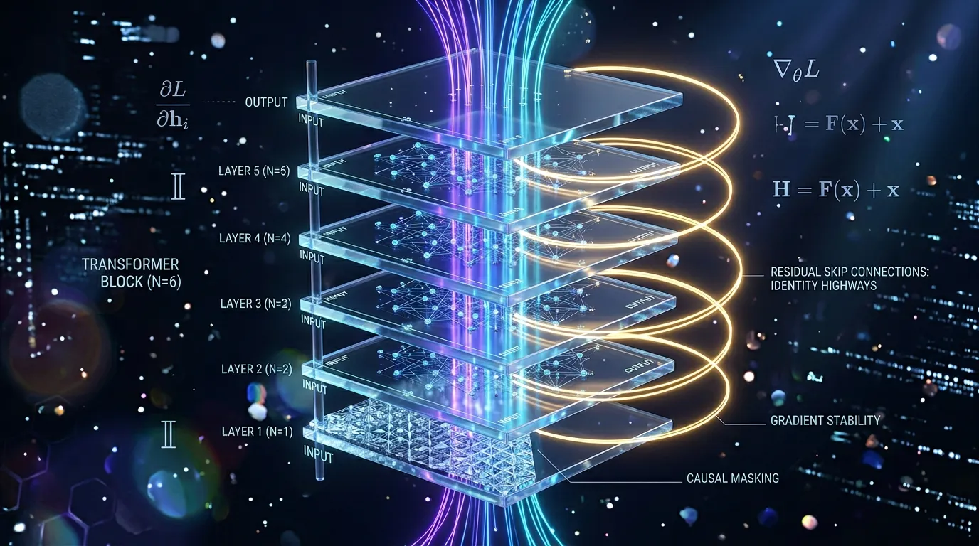 Learn to stabilize ultra-deep Transformer stacks using residual connections and LayerNorm. Master causal masking to enforce auto-regression and prevent leakage.