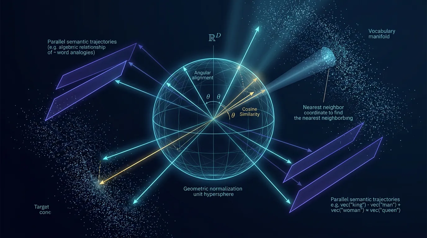 Master the formal geometry of Word2Vec. Derive cosine similarity, apply relational vector algebra for analogies, and explore discrete manifold search logic.
